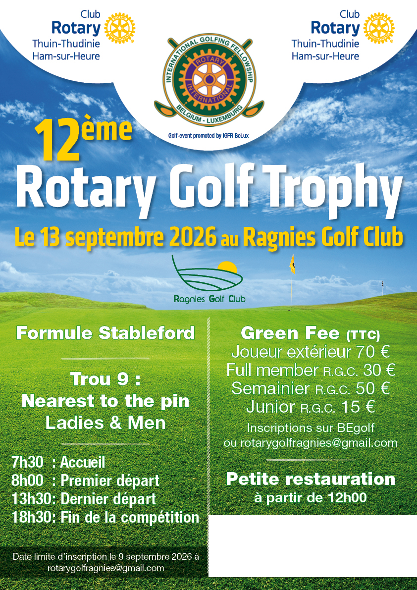 Ce deuxième dimanche de septembre, le Rotary club de Thuin-Thudinie Ham/sur/Heure organise son 12ème Rotary Golf Trophy. En effet, vu le succès des éditions précédentes, nous nous devions de réorganiser cet événement !